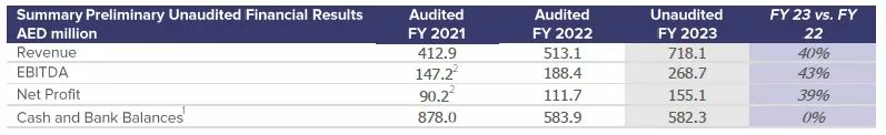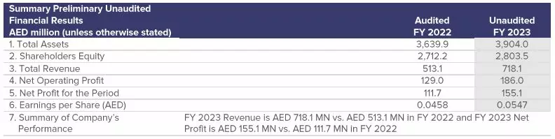 Net Profit: Grew by 39% year-on-year to AED 155.1 million in FY 2023