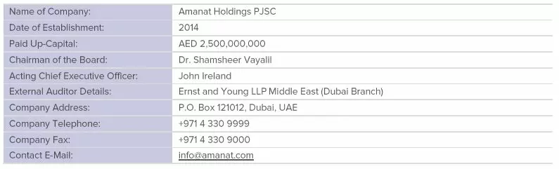 شركة أمانات القابضة ش.م.ع هي أكبر الشركات المتكاملة العاملة في قطاعي الرعاية الصحية والتعليم على الساحة الإقليمية بإجمالي رأسمال مدفوع يبلغ 2.5 مليار درهم. وتعمل الشركة المدرجة في سوق دبي المالي منذ عام 2014 على تأسيس والاستحواذ على الشركات العاملة في قطاعي الرعاية الصحية والتعليم ودمجها بنموذج أعمالها، إلى جانب تطوير وإدارة وتشغيل هذه الشركات في منطقة الشرق الأوسط وخارجها.